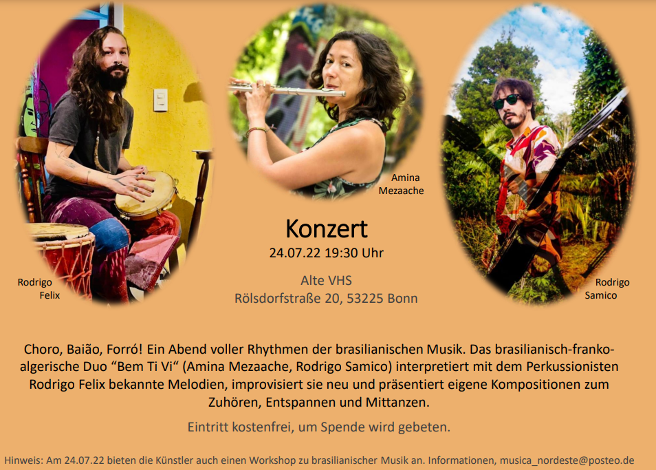 « Alle Veranstaltungen Diese Veranstaltung hat bereits stattgefunden. Forró-Konzert: Bem Ti Vi 24 Juli 2022 | 19:30 « Arbeitstitel Pogowalzer presents: Cupshot / rAuh / Molly Punch Spieleabend » Zum Kalender hinzufügen Google Kalender iCalendar Outlook 365 Outlook Live Details Datum: 24 Juli 2022 Zeit: 19:30
